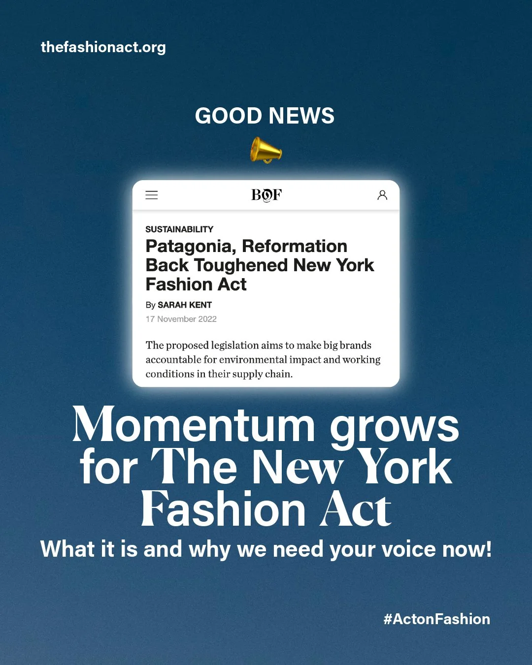 Share the campaign on social media to help us build the movement to get the Fashion Act passed. Available as story and post formats for individuals and organizations (here).
